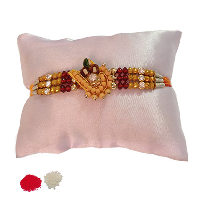 Traditional Rakhi is made of golden, orange and red beads. This rakhi is delivered with free pack of Roli & Chawal for tilak. Rakhi design may differ as per the stock available.